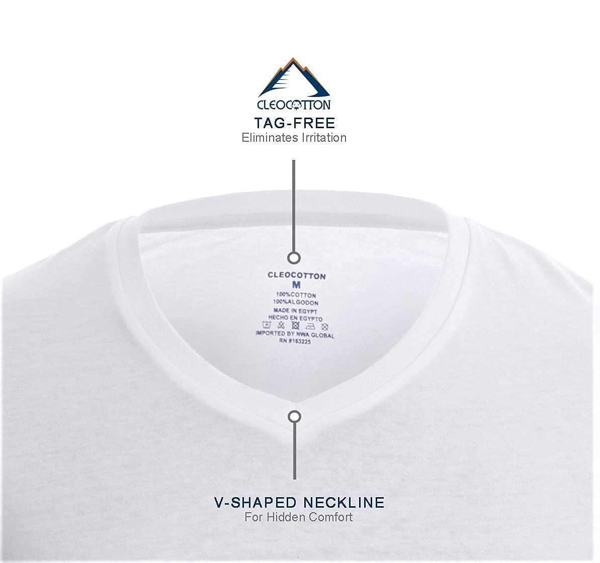 Features: Mens Cotton V-Neck white T-shirt. Slim / Tight Fit undershirt. Mens V-neck undershirt Available in 6 packs. Size Range S, M, L, XL & XXL. Cleocotton, Premium Mens V Neck T-shirt, men's short sleeve Vneck made in Egypt from Ring spung cotton rich blend ultra-soft .