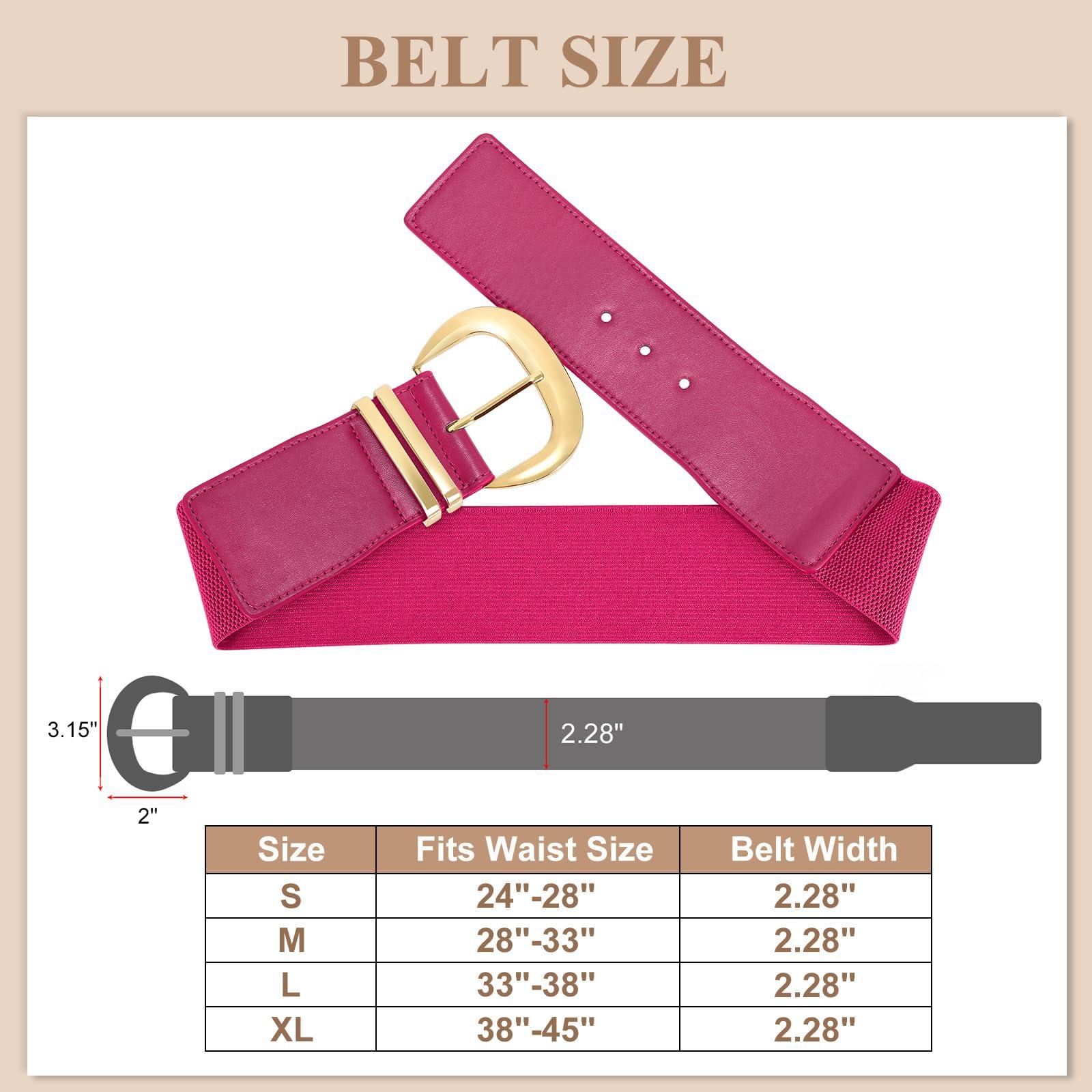 - Optional Size ColorsA variety of colors available in small to plus size. Black, brown, white, beige, green, red, navy, rose red, coffee women waist belts suitable for waist size 24"-28"/28"-33"/33"-38"/38"-45". Belt width: 2.28". Please measure your waistline to make sure this belt fits well before ordering.