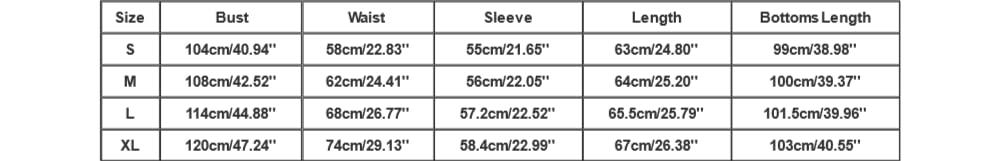 Size:S Bust:104cm/40.94'' Waist:58cm/22.83'' Sleeve:55cm/21.65'' Length:63cm/24.80'' Bottoms Length:99cm/38.98''